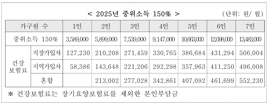 - 가구 소득 요건:기준 중위소득 150% 이하 가구 (2025년 3월 건강보험료 고지금액 기준)