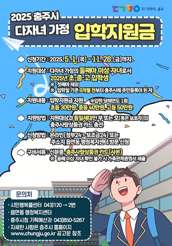 - 지원 대상: 2025년에 초·중·고에 입학한 학생 (※ 첫째 자녀는 지원 제외 / 입학일 기준 6개월 전부터 충주시에 주민등록이 되어 있어야 함)